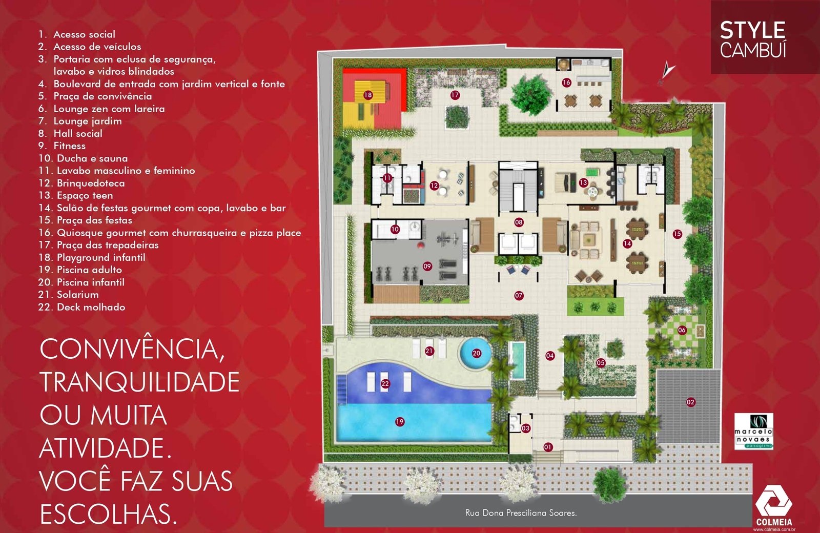 Conveniência, tranquilidade ou muita atividade, você faz suas escolhas. Com um boulevard de entrada e um jardim vertical, Style Cambuí dá as boas vindas aos seus moradores com uma área de lazer elegante e muito charmosa. Lounge zen com lareira, lounge jardim, fitness, brinquedoteca, espaço teen, salão de festas, piscinas adulto e infantil, playground, quiosque gourmet, sauna e muito mais.