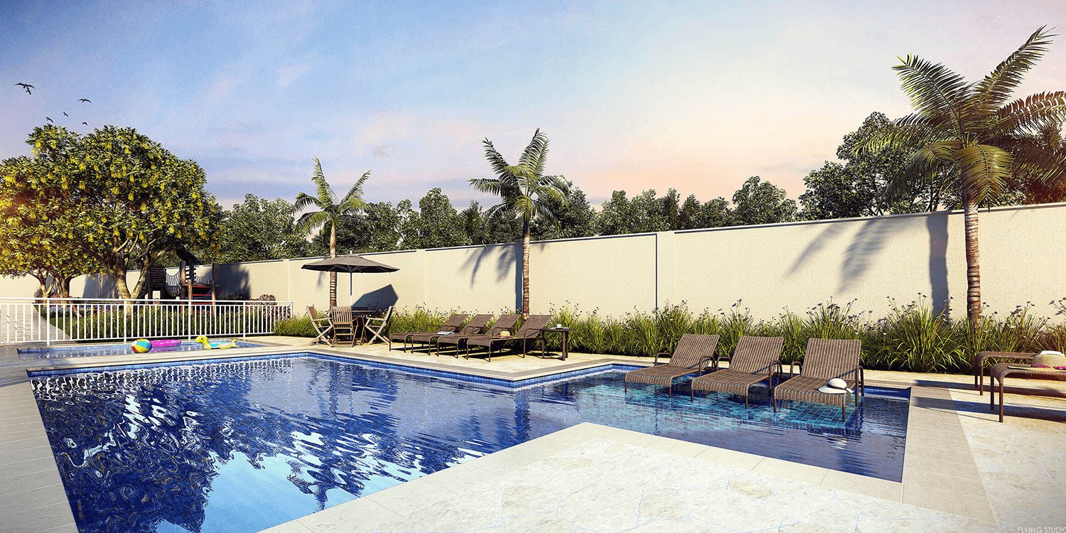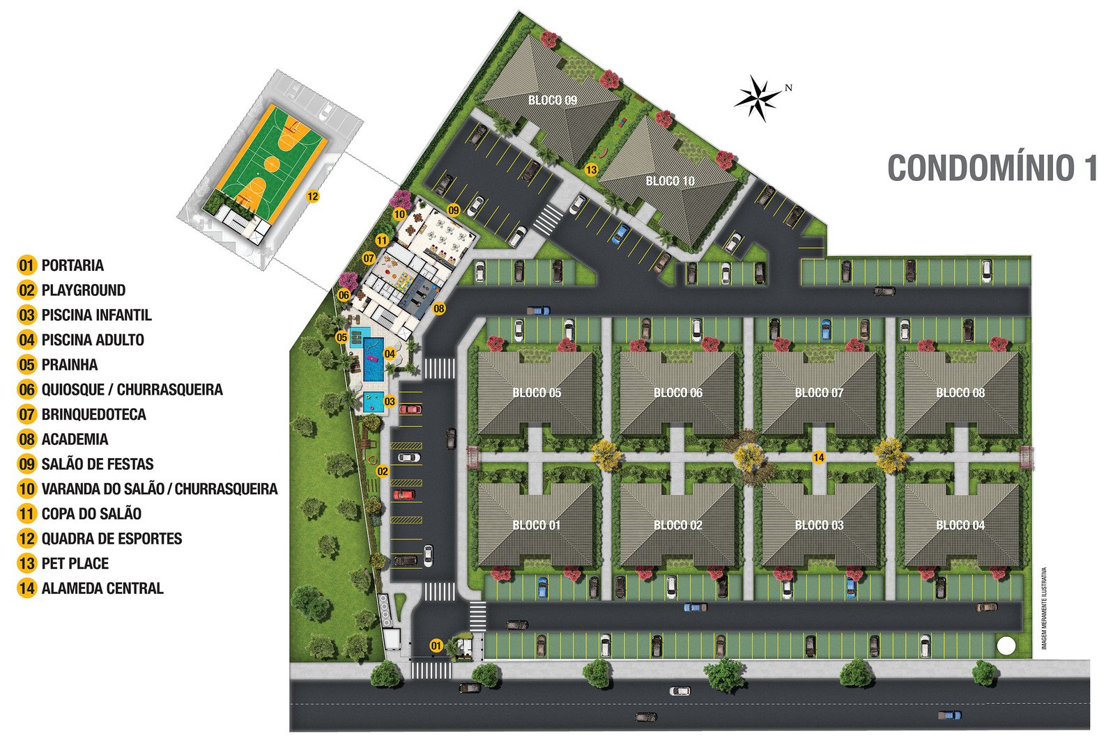 Os grandes destaques do condomínio são as piscinas adulto e infantil e a quadra de esportes. Além desses itens, temos uma linda entrada com alamedas, playground, quiosques com churrasqueira, salão de festas, academia e brinquedoteca.