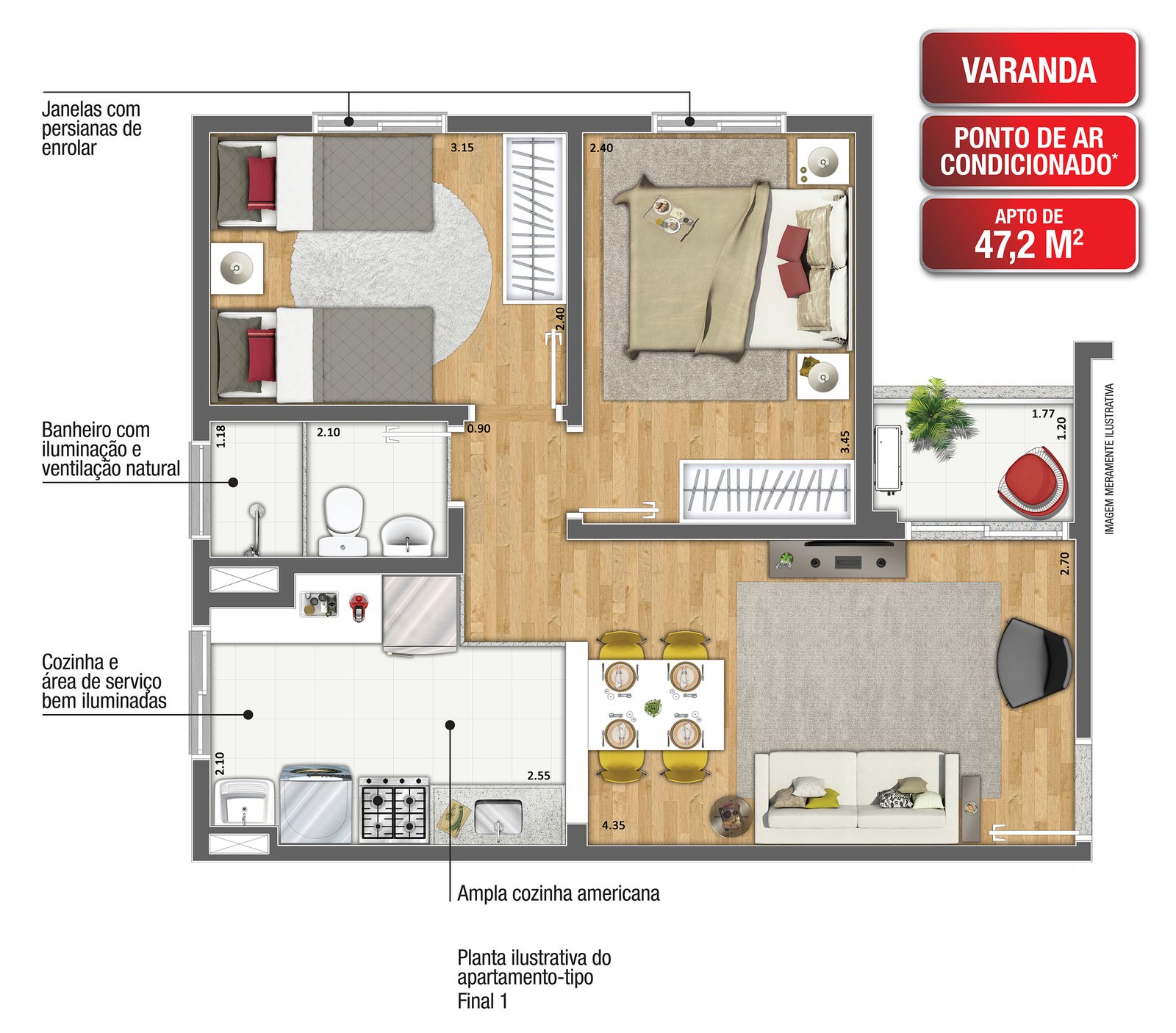 O Alameda Ouro Verde oferece tudo que você e sua família precisam. Apartamentos de 47m², 2 dormitórios, varanda, ponto para ar condicionado, janelas com persianas de enrolar e muito mais.