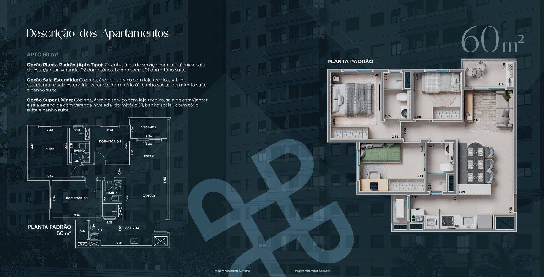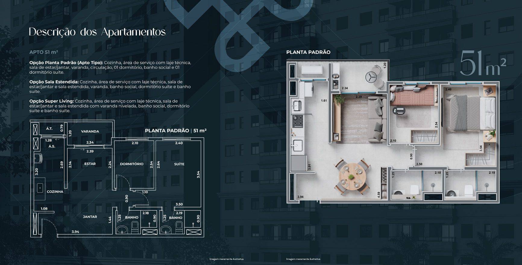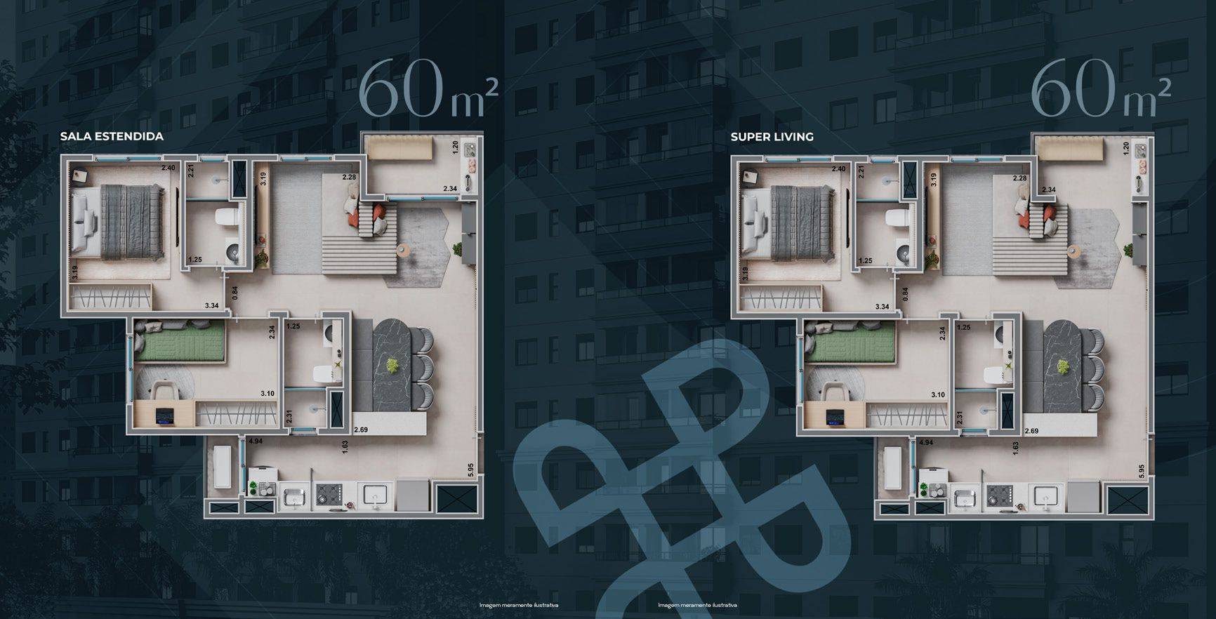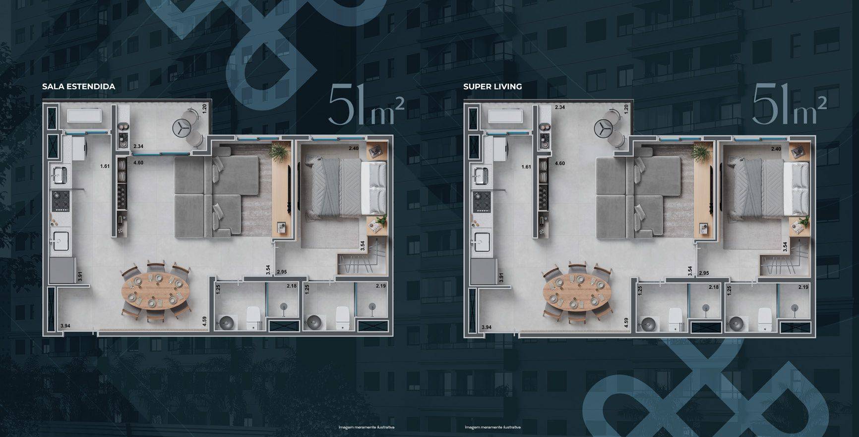 Serão 2 torres com apartamentos de 51m² e 60m², todos com varanda.